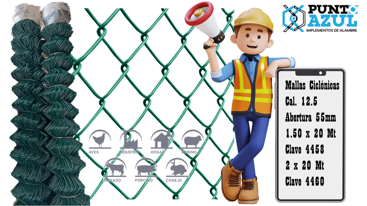 La malla ciclónica es un tipo de cerca fabricada con alambre de acero entrelazado en un patrón de rombos ó diamante. Puede tener ó no, un recubrimiento de PVC en color verde, pero siempre se encuentra disponible en rollo. La malla ciclónica sirve para cercar, limitar y seccionar gran variedad de espacios, tanto exteriores como interiores, proporcionando una barrera de notable fortaleza.